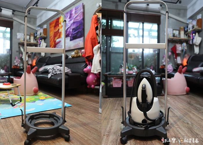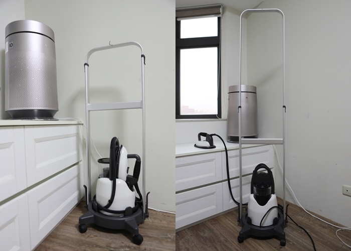 立起來的專用掛燙架還可以將LAURASTAR LIFT 高壓蒸汽熨斗直接放在上面推著走,不然女生提著這一台還是稍微有點重量,掛燙架這真的也太方便了,且一整個搭配LAURASTAR LIFT 高壓蒸汽熨斗主機的質感,超美。 |