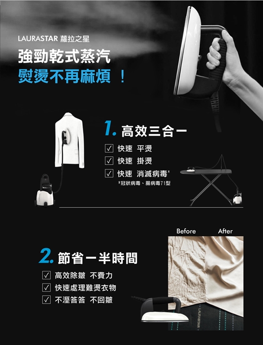 給LAURASTAR LIFT 高壓蒸汽熨斗三分鐘,它就可以還妳平整時尚的好衣物。 |
