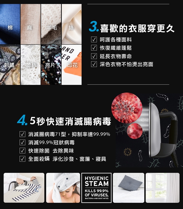 最吸引太妃的其中一個功能就是,高達150度的蒸汽,在燙衣同時還能殺死99.999%的細菌與100%的塵螨,確保衣服不只燙好,更能做到殺菌及淨化,雖然一般傳統的蒸汽熨斗也可以,但是加熱時間常以外又很重,而且噴出來的大多是水,會搞的想要消毒的東西都濕濕的。 |