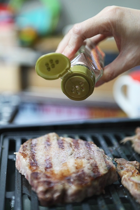雖然是不沾塗層,但是我們家烤肉還是會塗上奶油,一點奶油香氣的牛排真的很迷人!! |