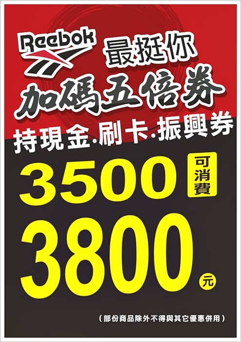 Reebok台南民族店結束營業3.8折起大出清真的超級好買,除了本身特價再打折扣以外,如果使用五倍劵的話還可以繼續加碼上去,真的是敗家的機會啊!! |