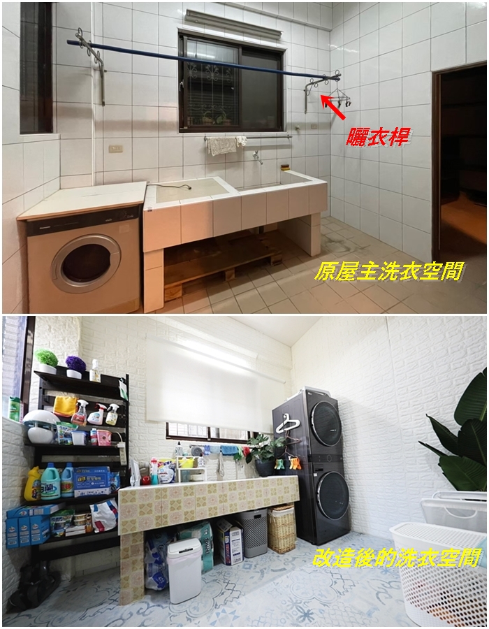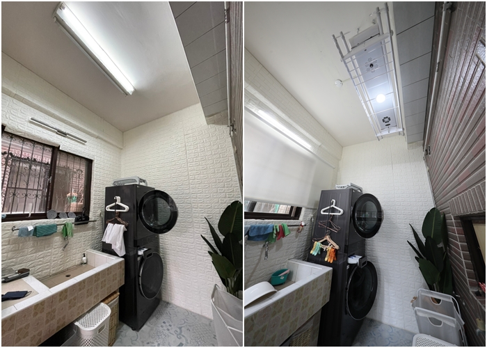 一樓室內洗衣間裝上HCG電動曬衣機後整個美感跟科技感大大提升,前後對比照看起來就差很多,有了HCG電動曬衣機後洗衣空間更完整了。 |