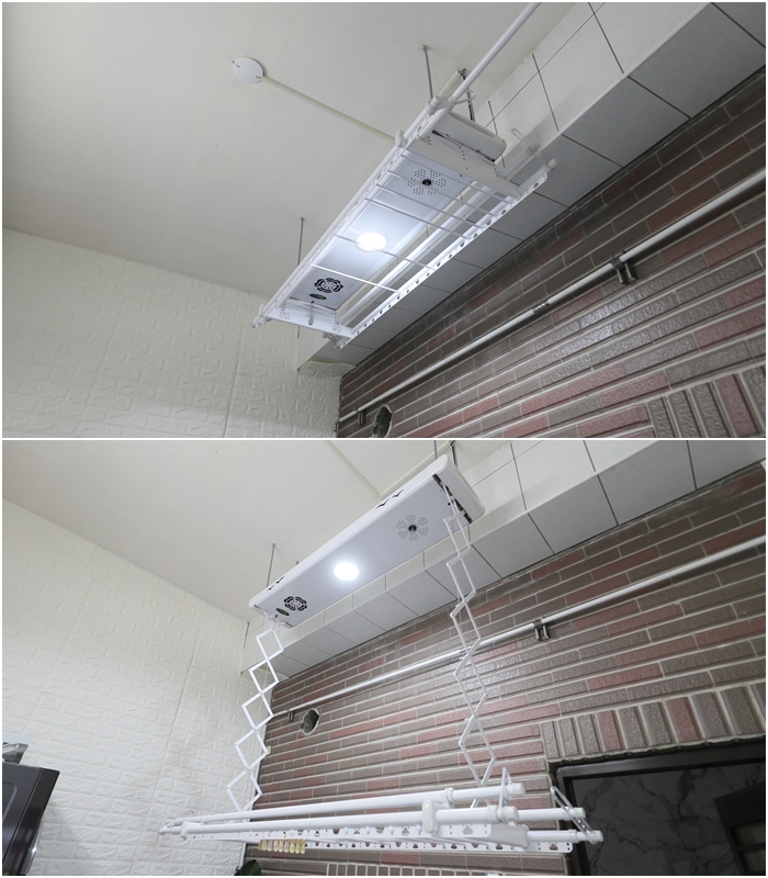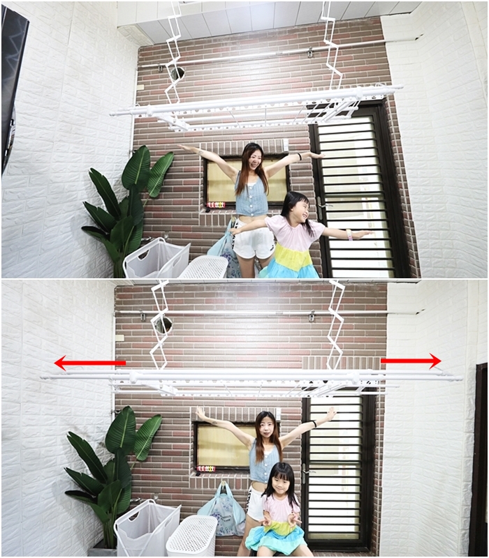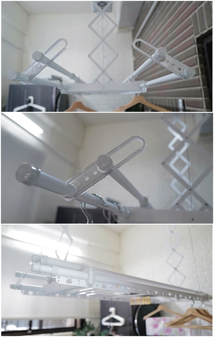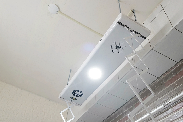 因為天花板挑高的關係,為了讓我跟太妃可以更輕鬆曬衣服,安裝師傅以降低高度的方式安裝,所以大家不用擔心家裡空間設計會影響安裝曬衣機,因為除了可以事先評估之外,安裝現場師傅也會再次確認與說明!