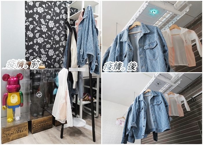 以前沒有疫情的時候我們玄關都會放衣架,出門臨時穿的外套跟防曬外套回來順手就會掛在衣架,但是疫情後回到家除了噴酒精殺菌以外,身上衣物我們就會直接拿到後面洗衣間直接掛在電動曬衣機讓殺菌燈殺菌,雙重保護更加安心。 |