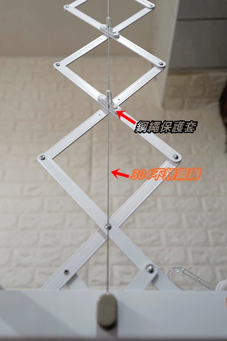電動曬衣機升降的鋼繩使用304不銹鋼繩,更穩固更耐用,還有鋼繩保護套,有了這些安全機制,我們也能安心讓小孩陪我們一起曬衣了 |