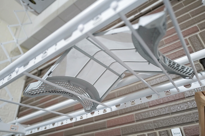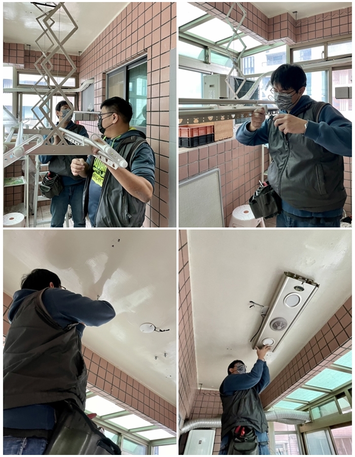 安裝師傅非常專業,會反覆確認在美觀上、安全上、便利性上都符合屋主的需求,也會與我們討論確認後,再開始著手安裝。這次一樓挑高的洗衣間安裝的是豪華四桿曬衣架,二樓採光罩露臺則是舊家的旗艦款曬衣架,真的辛苦師傅了,大熱天的天氣在露臺幫我們安裝。