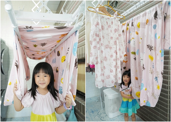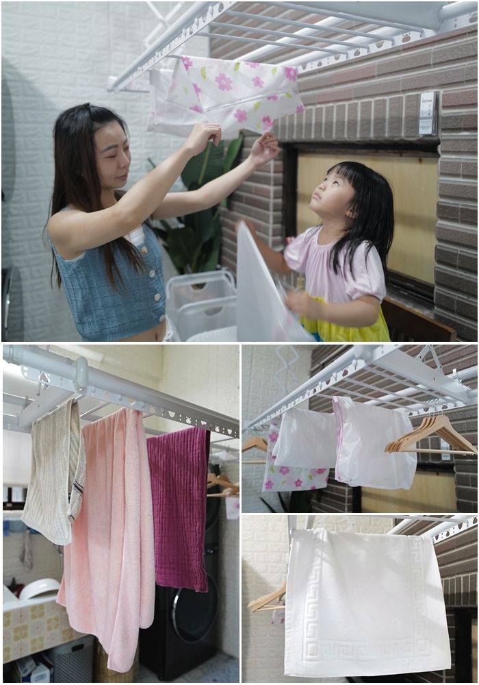 平常曬衣跟曬被單的時候,Cola都會幫忙,這也是長期以來養成的習慣,自己的衣服跟幼兒三件組都是她自己晾曬,可以升降的高度是剛好小朋友也可以吊掛的高度,使用了半個月左右,證實到目前為止,HCG電動曬衣機確實能承受新竹風,本來還會擔心上升下降的時候會過於搖晃,結果使用上都非常穩定,即使面對新竹強陣風也依然正常升降。 |