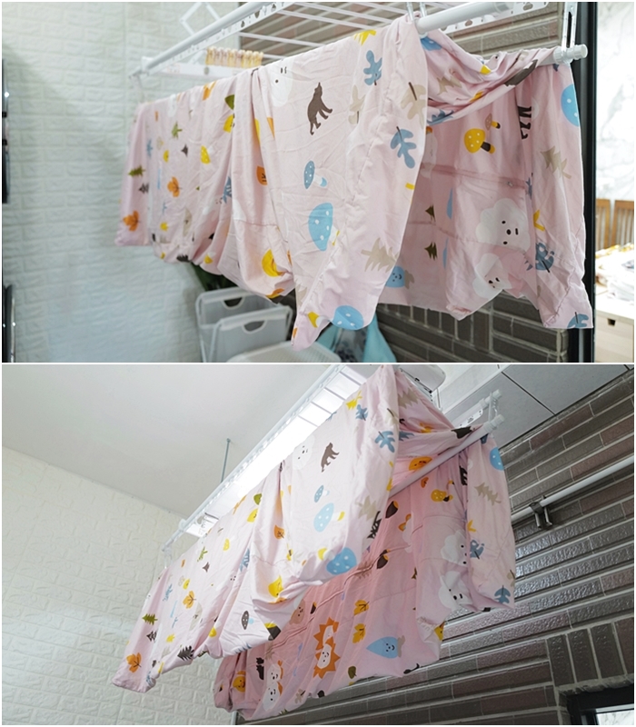 客製加大尺寸床單可以曬雙桿,這樣會乾的比較快唷,加上對流扇真的很方便,如果衣物較多,一邊曬單桿被單一邊曬衣物同時進行超省空間。 |