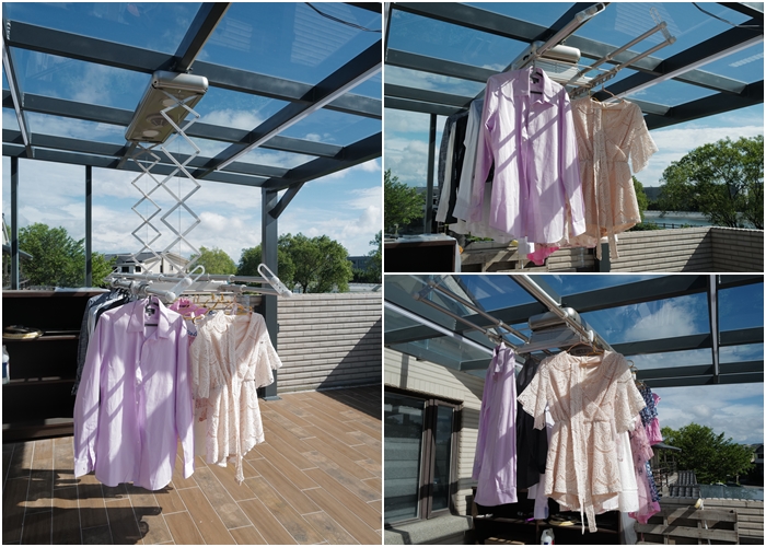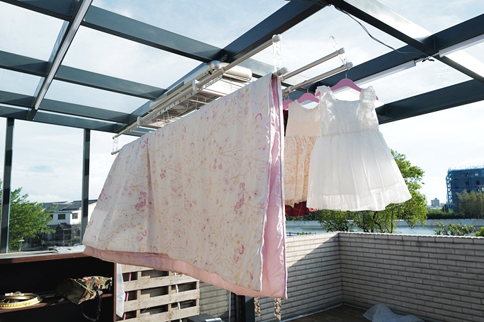 因為二樓露臺是使用玻璃採光,所以有充分的陽光,這邊也是我們平常主要的曬衣空間,讓衣褲跟被單可以完整地享受陽光的溫暖,太陽曬完的味道真的很好聞;但是…如果又像前陣子那樣每天都在下雨下不停,真的會很憂鬱,但是若想要馬上有想念的陽光味的話,靠這台旗艦烘乾款的烘衣功能就沒問題啦!