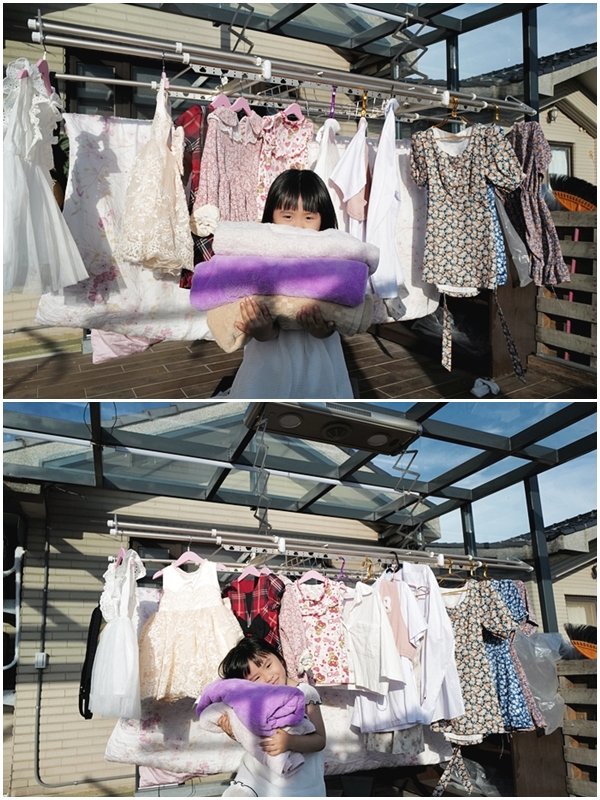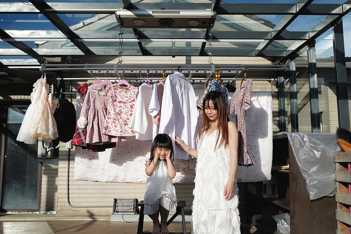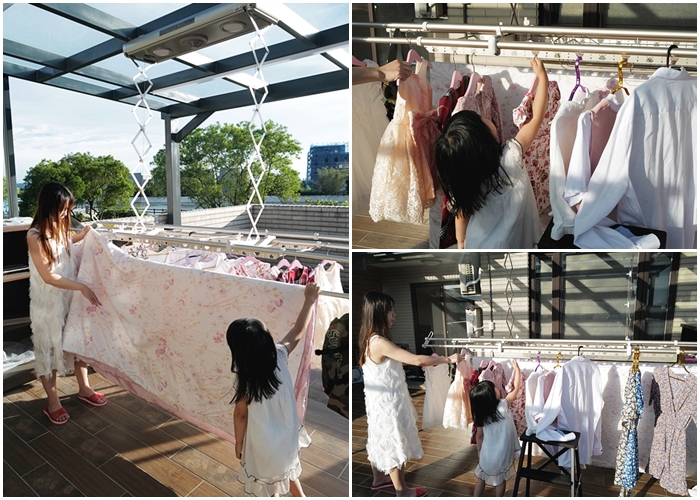就連收衣服的時候也是Cola親自來收她的衣服,她每次收衣服的時候都會聞一下毛巾與衣物的味道,都會跟我們說好香喔,這就是太陽給予的溫暖,但是如果沒有HCG電動曬衣機的話,那曬衣收衣就會變成一種地獄,光是在上午或是下午時段,一件一件拿曬衣竿吊掛到上面真的會汗流浹背又狼狽,但是有了電動曬衣機,就可以在短時間優雅的曬完衣服,又可以得到溫暖的香氣。