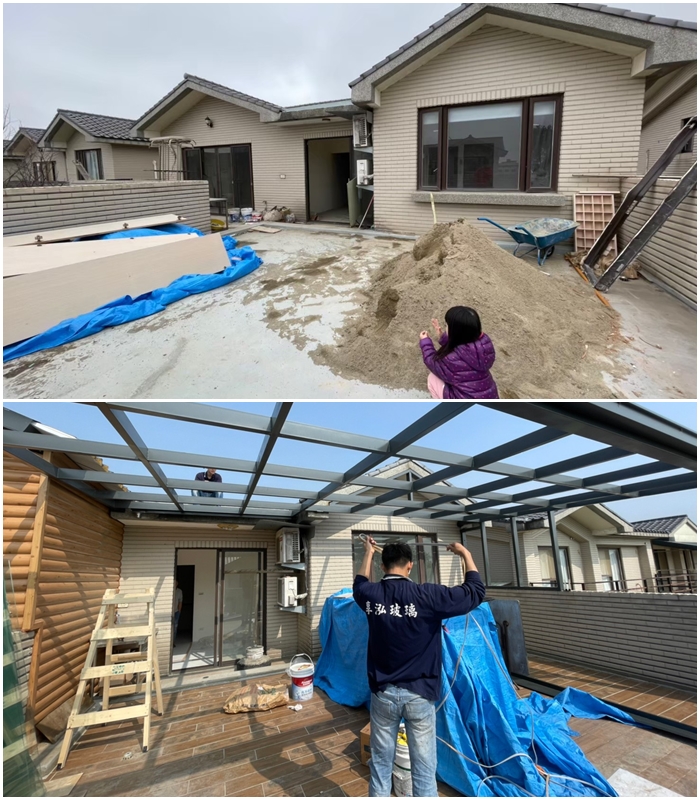 除了要安裝新機豪華四桿款在洗衣間之外,另一台原有的旗艦烘乾款要移機到二樓的露臺上!我們的新居有一個超大露臺,大露臺真的很實用,烤肉聊天、夏天游泳池戲水都很適合,前屋主的露臺就空空的,後來跟太妃討論後,決定請師傅來幫我們蓋個遮雨棚,為了採光度所以選擇了玻璃天花板,再搭配木紋磚,忙了大半年才終於把露臺處理好。