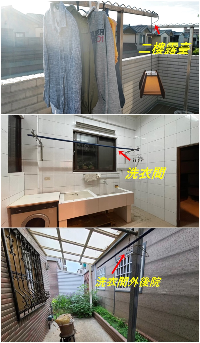 在曬衣機安裝好之前,我們原本曬衣只能用前屋主留下來的曬衣桿,主要有三個曬衣空間,二樓曬衣架底座是水泥輪胎塊,雖然很實用,但是就是醜,加上竹竿每次曬完都要拿下來,不然新竹的風真的超大,一個不小心你家的曬衣竹竿就去別人家串門子了,即使吊掛衣服後,也很有機會看到你們家的衣服在別人的一樓遮陽頂蓬上,自從我搬來這裡後,一個月總要看個幾次鄰居的棉被在馬路上!!!