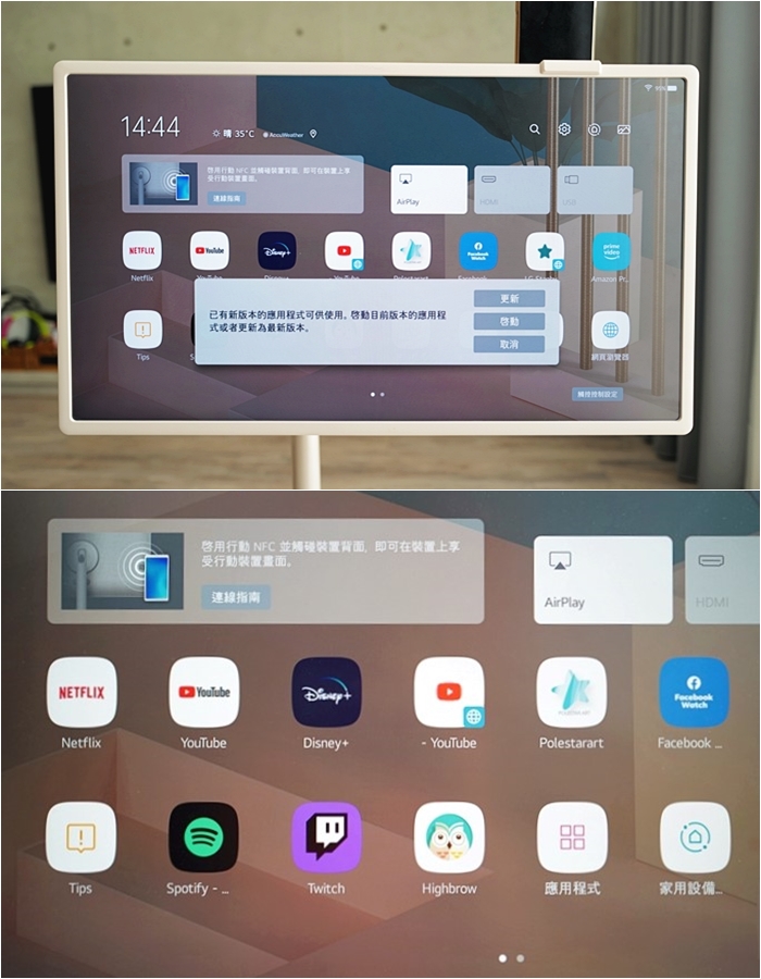 LG StanbyME閨蜜機本身內建超多追劇APP,大家熟知的Netflix、Disney+、Twitch等應有盡有,還有大家最常用的Youtube,也有臉書的應用程式,如果有常在開直播也很適合,搭配手機夾看大螢幕更方便。