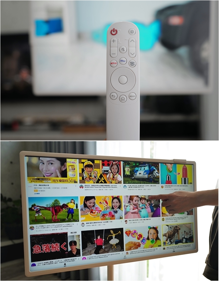 LG StanbyME 閨蜜機除了使用遙控器控制以外,當然少不了最方便的螢幕觸控,遙控器設計的非常簡潔,基本上一目了然不會太過於複雜,遙控器上也直接有三個熱鍵可直接進入Netflix / Disney+ / Prime video,唯一可惜的就是沒有LG搭配本身最強的動感遙控器,不然這樣控制起來更方便。