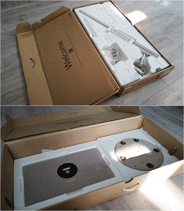 收到LG閨蜜機馬上開箱,內容物分成兩層商品堆放,組裝不會太難,但是頗有重量,建議兩個人一起組裝較為保險,底座跟立桿組裝都不困難,整個過程就只有一個部分需要小小注意一下。