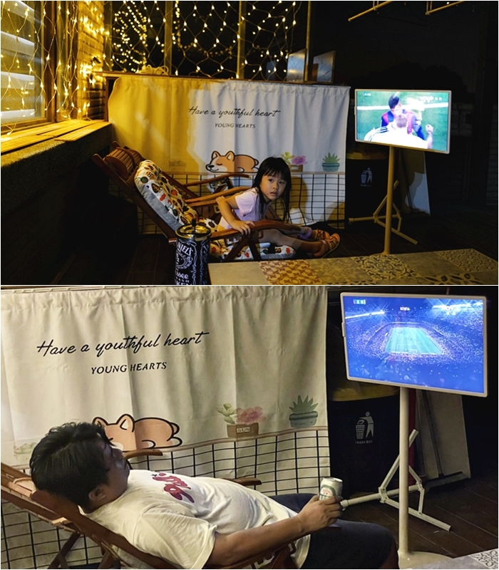 晚上想放空看個球賽喝瓶啤酒的時候,就會把LG StanbyME 閨蜜機推到露臺,以前在家裡都怕音量太大會吵到太妃跟嬰皇,現在都在露臺看完全不會吵到它們,在露臺烤肉的時候搭配應用程式立馬變成KTV。