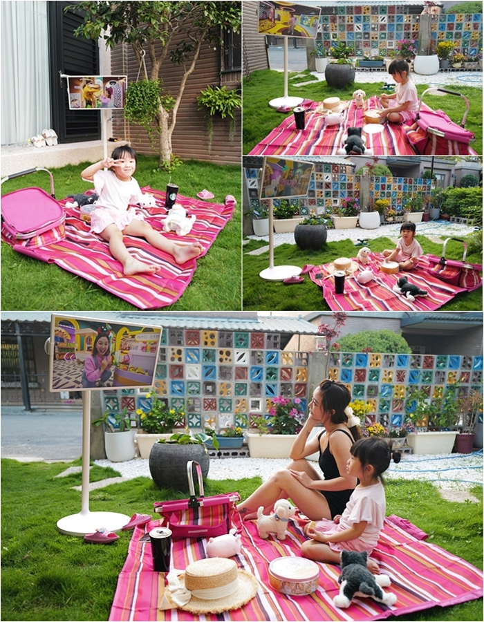 戶外野餐當然也少不了娛樂設備,電池可以續航三個小時,Cola最近也熱愛野餐,常常動不動就在自家庭院野餐,也會約社區的小朋友一起來野餐,閨蜜機就變成了它們的移動電影院,帶去露營也都很方便。