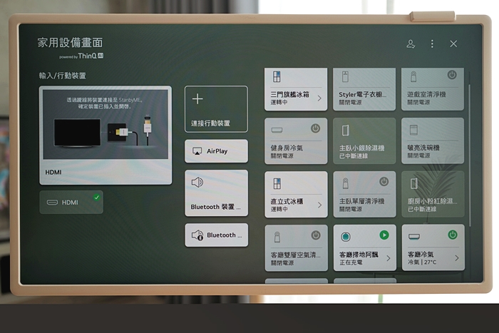 LG StanbyME閨蜜機也把最強的IOT概念全部都整合在這一台電視裡面了,對男孩子來說一整個就是夢寐以求的概念,把IOT的完整概念實行在這一台電視上面,右手邊可以看到目前連結的IOT設備,不管是冰箱、洗衣機、空氣清淨機、除溼機等設備都可以連接到電視上面,讓你邊看電視就可以邊操作家裡面的全家電商品。