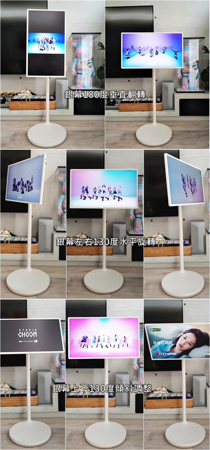 先來看看硬體的部分,LG閨蜜機可以應付各種觀看視角,找到你最舒適的角度,上下有20公分的高度可以調整。