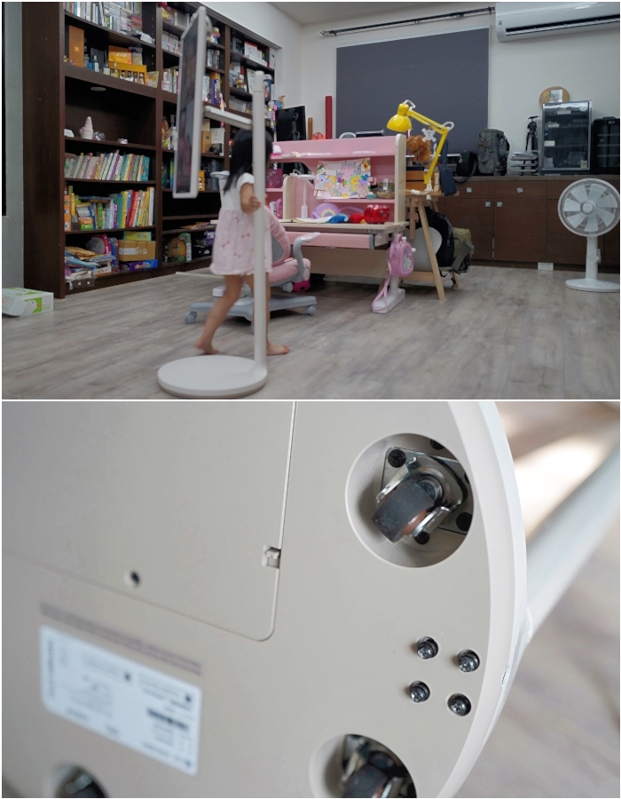 LG StanbyME 閨蜜機底座有五個360度萬向輪,加上底座加重,所以推拉起來非常穩,小朋友撞到也不會側倒,萬向輪非常滑順,連我家Cola都可以輕鬆拉著走,最近她常拉著這一台閨蜜機四處溜搭。