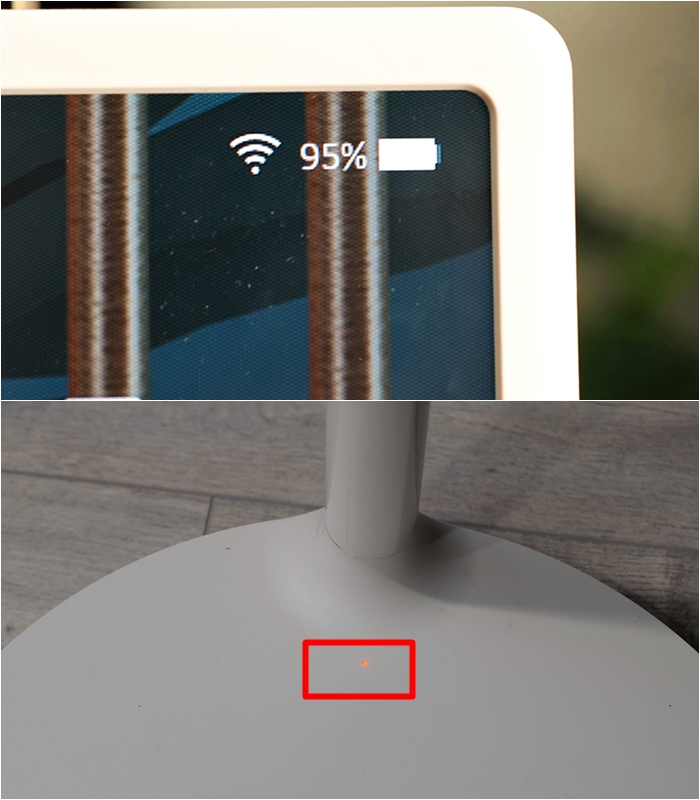螢幕右上方會有電亮的量表,底座的部分則是由燈光來代替,綠燈代表充滿電源,降到70%以下則是會呈現橙色燈號,紅色燈號顯示的時候就代表電量快用光了,完全耗盡電量充電的速度也非常快,也因為無線的特色滿足了家庭每個角落可移動的便利。