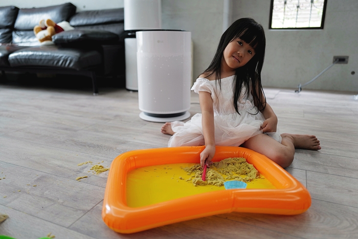 空氣清淨機的重要性最主要還是為家人守護,尤其當Cola會在客廳及遊戲室玩耍時都會造成許多灰塵產生,像在客廳玩沙時, 超淨化大白空氣清淨機-Hit就會開始警示了,立馬轉變紅燈開始努力工作。 |