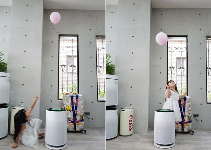 以前從來沒測試過,因為這次看 超淨化大白空氣清淨機-Hit的出風口較特別,特別放了一顆氣球上去,氣球就這樣停留在高空中,表示氣流非常穩定,就像循環扇一樣。 |