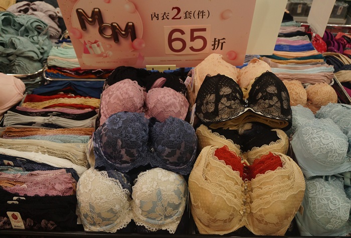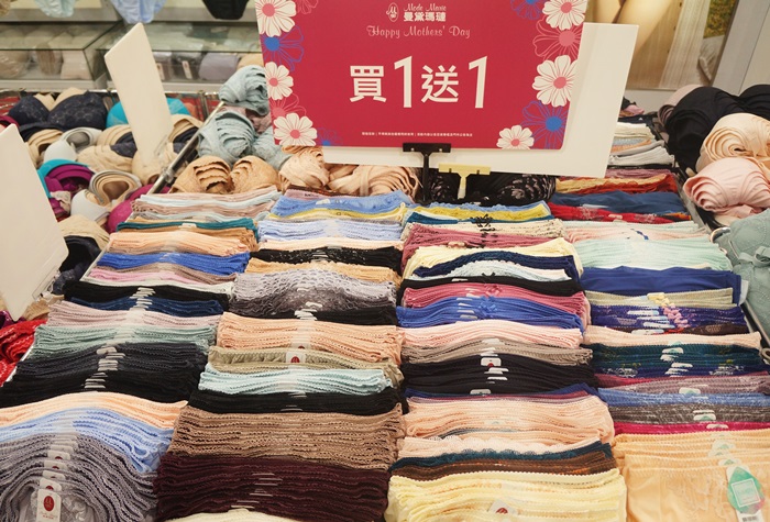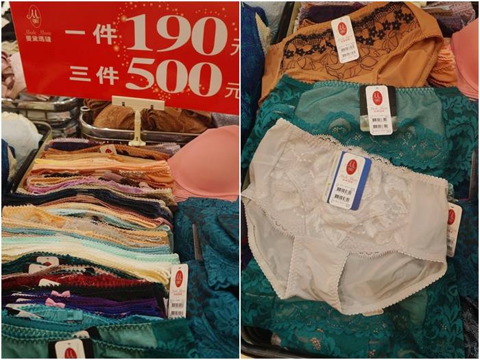 這區真的非常划算,拍照當天就有很多朋友搶先來採購了,花車超多台的很好買,款式也是多到一個眼花撩亂的地步,曼黛瑪璉的蕾絲真的都很漂亮,做工也非常細緻,裡面也有很多女性朋友喜歡的無鋼圈內衣,在家裡面穿起來就是舒服,搭配小褲一套甜甜價格就可以帶回家,買越多越省。