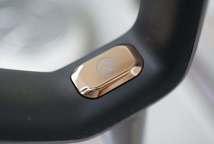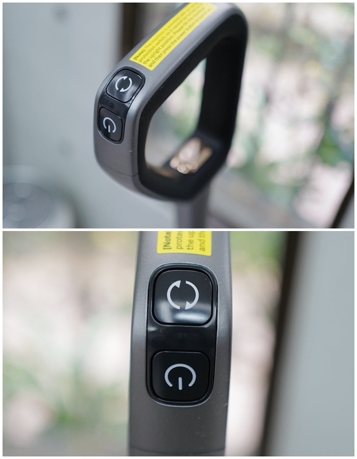符合人體工學設計的手柄,貼合手掌使用起來相當舒服,雖然是塑料材質,但是也滿比較親膚的,手柄上有三個按鍵,分別是開關鍵、增強風力鍵以及自清潔鍵。 |