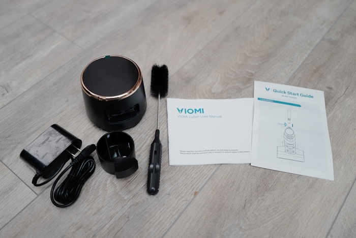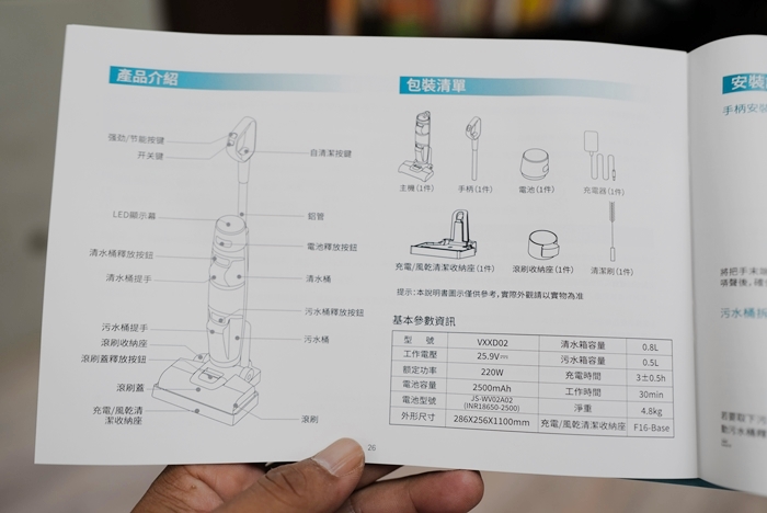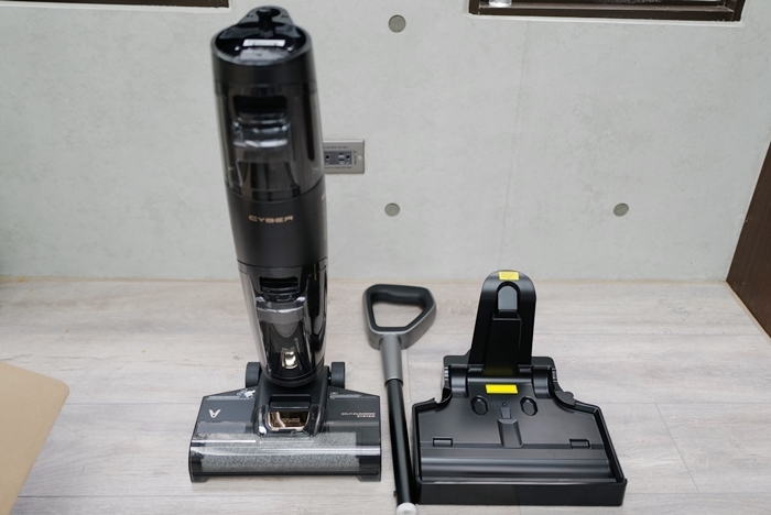 我買的是基本款,配件有雲米智能洗地機Cyber:主機、充電底座、電源線、電池、清潔刷、清潔刷底座、電池底座、以及說明書。