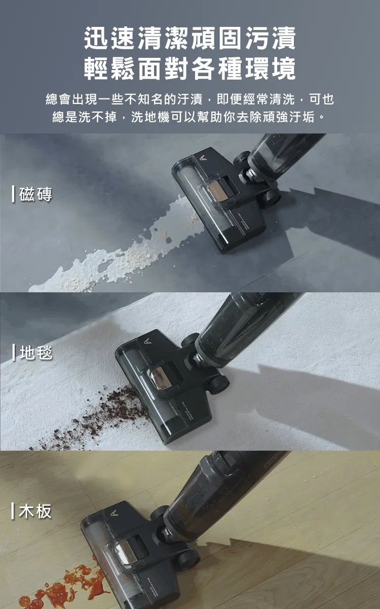 當初看上無線吸塵洗地機就是它的洗地去汙能力,基本上這兩年洗地機的成熟度都可以輕鬆應付這些讓人煩惱的髒污,即使是醬料茶水等難擦的污漬都可以解決,也適用於各種地面,去年爸爸在老家買了其他品牌的洗地機後,一直說終於地板可以乾乾淨淨的,更別說一直進步的洗地機,清潔功能都是基本功了,沒啥大問題,清潔度讓我們很滿意。 |