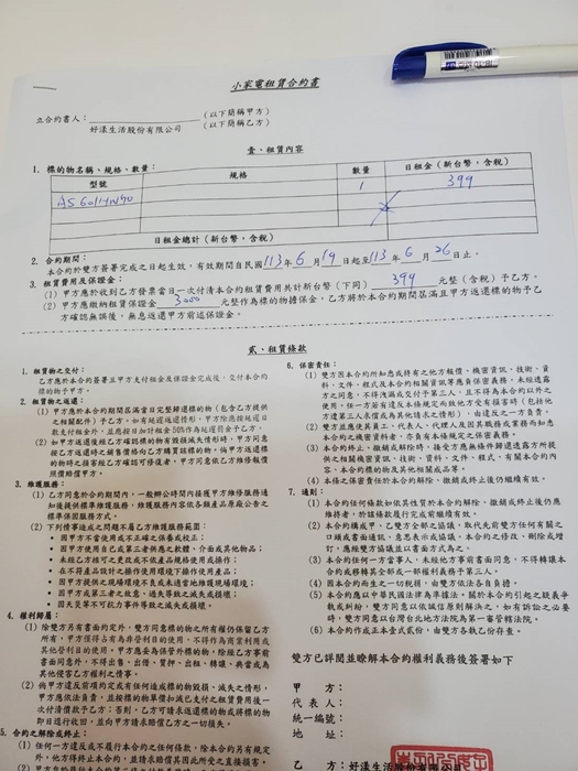 承租人只要簽名付錢就好了,簽兩個空白處跟留下手機號碼,不管任何家電都是一天399元,例如我是6/5號晚上大約7點左右去租,店員說我只要6/6關門以前拿去還即可。 |