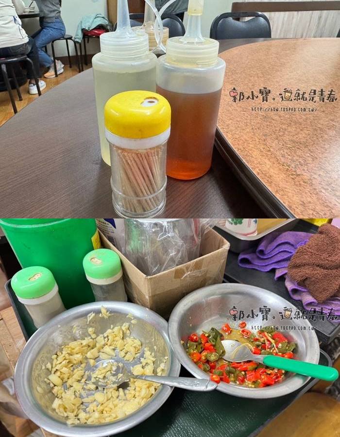| 醬料桌上有提供店家自製的辣椒油,有一定的辣度且香度濃郁,另外比較特別的就是有提供剁碎的生蒜頭,生蒜頭搭配很多菜都很對味。 |