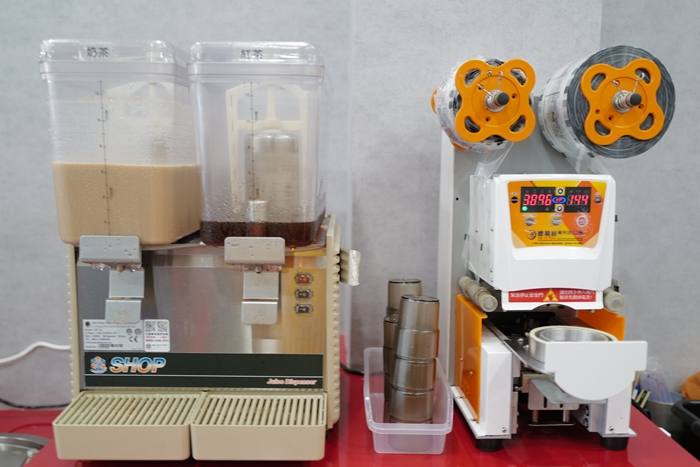 | 旁邊還有奶茶跟紅茶,隔壁還有一台封口機,不知道是不是可以讓客人外帶? |