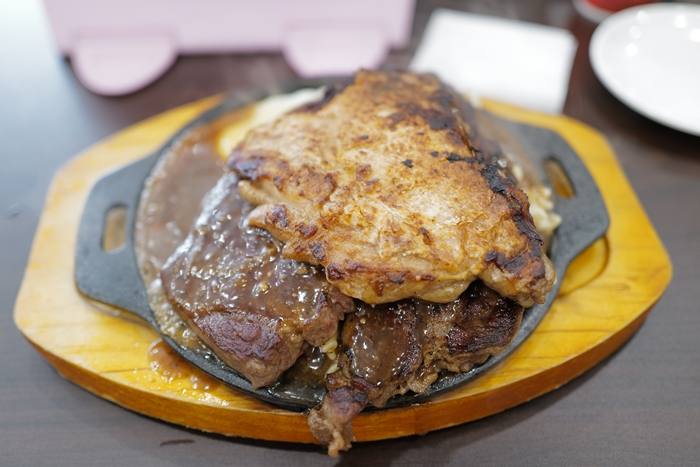 | 不管哪間平價牛排館,我通常都是點最大分的牛排加雞腿排,這牛肉確實看起來頗具份量,大食量的朋友滿可以選擇這一塊的,這一份雙拼顯得鐵板有點小了XD |
