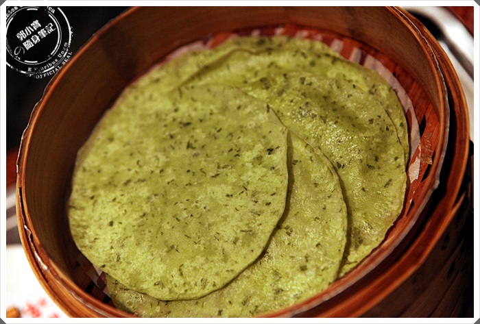 蒸籠理面的是三星蔥餅皮,一整片都是綠油油的看起來就很美味。 |