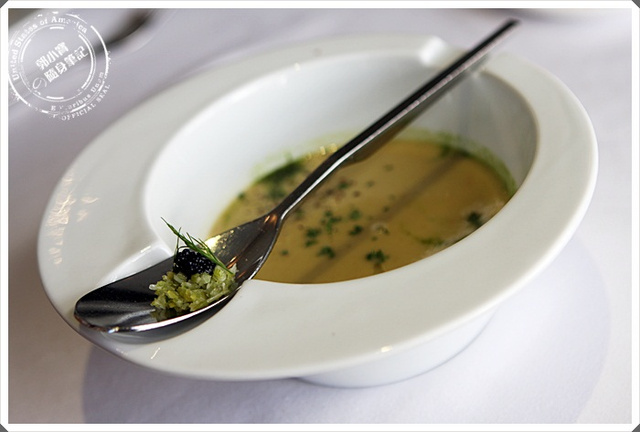 這道蔬菜泥湯我喝起來還滿喜歡的,清甜的感覺加上濃郁的口感,湯匙上的魚子蒜苗下去攪拌後,