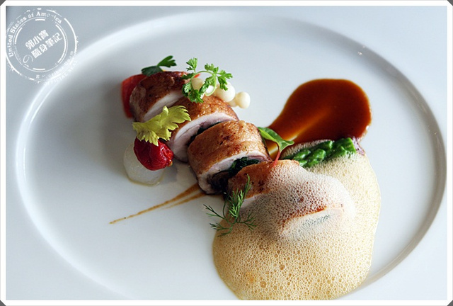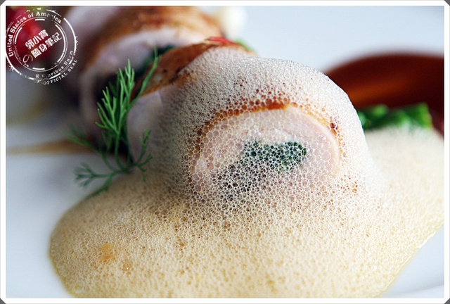 牧場放山雞肉佐雞肉汁及花雕泡泡 850元 |