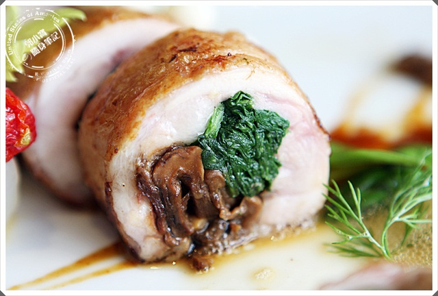 雞肉卷理的牛肝菌的醇厚香氣搭配清甜的波菜,味道上非常的搭,雞肉也滿嫩的,