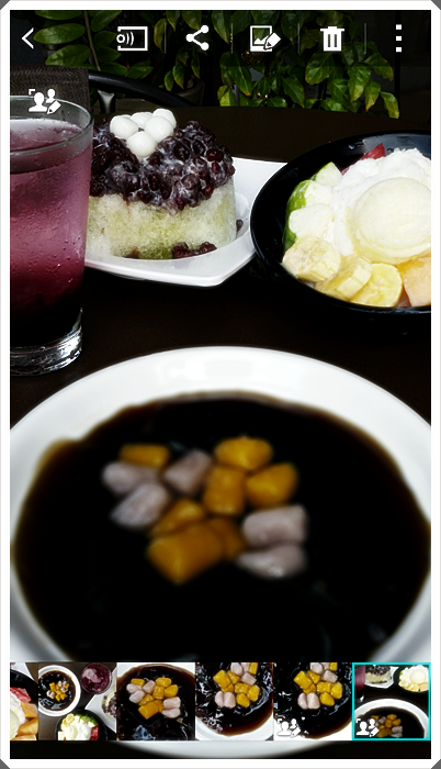 點選中間的後景深模式,你可以看到畫面上當場嫩仙草的部分就會變得相當模糊,背景的冰品加上樹葉也都相對的清晰,不管在風景上還是食物上,GALAXY S5都可以處理的相當完整及成功。 |