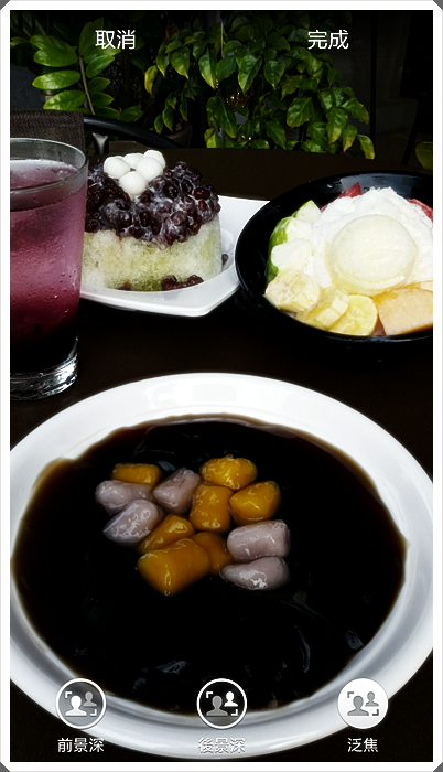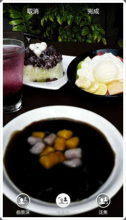 這就是前景深的選項,可以看到除了嫩仙草以外,背景其他的冰品模糊的程度都相當的棒,如果你喜歡這樣的話,那就按右上角的完成,他就會生成一招照片檔的規格出來,如果你喜歡別的對焦點的話,那下方會有三種選項 |