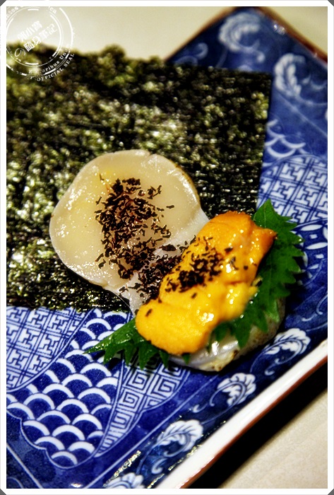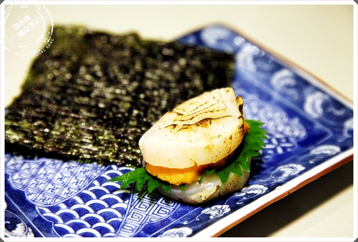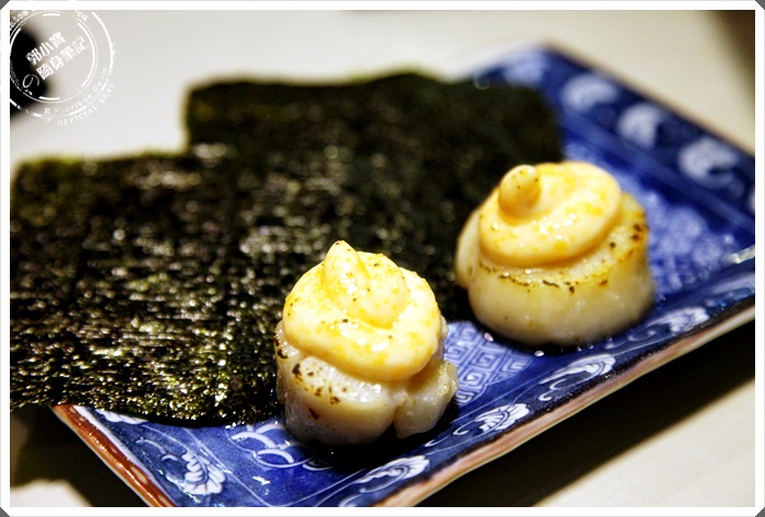 兩顆生鮮等級的干貝炙燒過後,上面塗滿了明太子美乃滋在加上海苔入口,一整個就是滿足,但是相同的老問題,偏甜美乃滋又出現了,難免最後會有點膩,而且搶到明太子的滋味,個人認為可以用番茄去打美乃滋,搭配出干貝白與番茄明太子顏色較鮮艷。 |