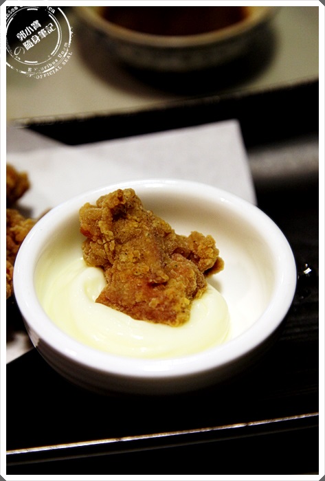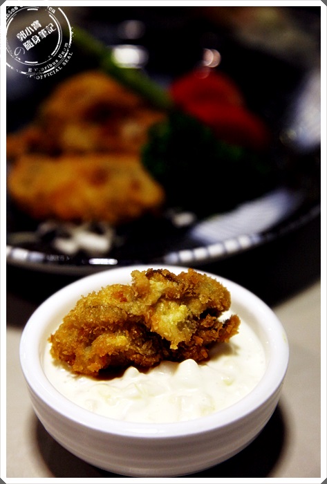 沾上店家提供的美乃滋醬非常的搭口,美乃滋醬偏甜,醬裡面還可以看到水果果肉,沾上炸牡蠣變得挺爽口的。 |