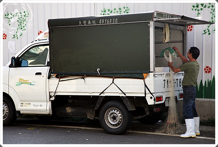 結果吃完後要離開時,看到老闆默默的在他的貨車後面補魚網,在平鎮這個地區看到有人再補魚網真的滿點點點的XD