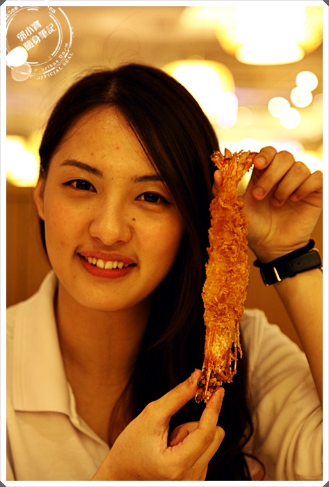 即使不是虎蝦,我們依然要堅持把明蝦放在臉旁邊試試看比例尺,一樣是比臉大的炸明蝦,尤其又是美女拿過的明蝦XD |