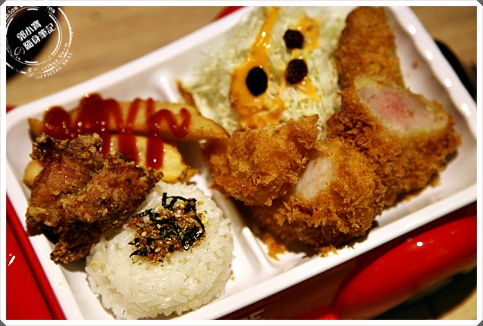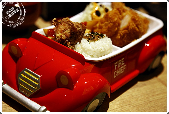 勝政日式豬排也有準備兒童餐,所以一整個相當的適合全家大小一起來用餐,兒童餐的部分不管是豬肉還是配菜都有再調整過,都是適合小朋友的飲食口味,重點是這台紅色小跑車一整個就是小朋友的菜啊!! |