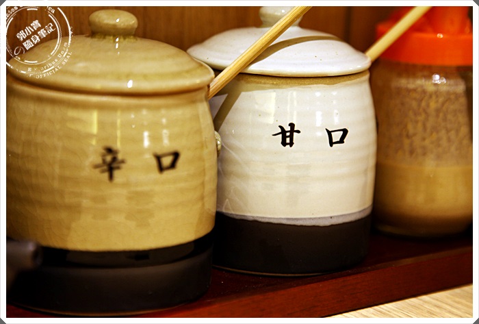調味料都擺飾在桌上,兩個大陶罐上麵還有註明豬排醬的味道,甘口偏甜辛口偏辣,依照自己喜歡的口味調醬。 |