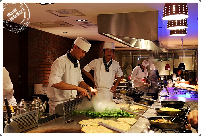 說真的看到自助餐廳有蒙古烤肉就很訝異了,隔壁還有鐵板燒區更讓我驚訝,這些通常不會出現在自助餐廳的通通出現在品花苑了,廚師一樣手忙不停的在為每個消費者現炒食材。但是看著廚師現炒也是一種享受,不像一般的自助餐廳都在內廚房大鍋菜的做一做就往外倒。 |