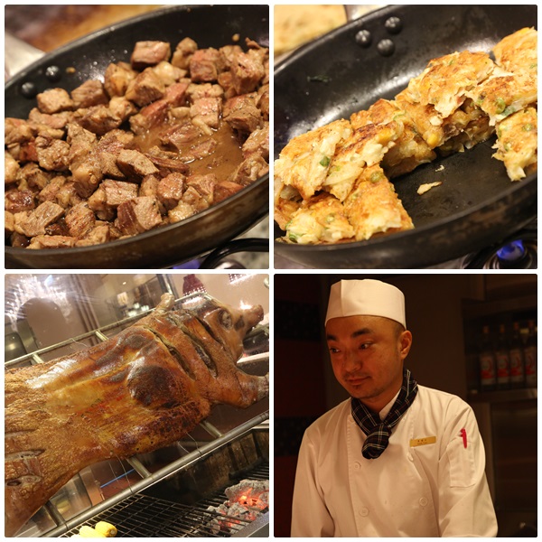 除了前台有炒飯以外,還有提供海鮮煎餅跟牛肉切丁,鐵阪師傅炒完後都會放在前台的平底鍋加熱持續保溫,讓每個客人吃到的都是熱騰騰的,誇張的是這邊還有烤乳豬,但是這隻烤乳豬只能看不能吃,因為今天烤的是要給明天的客人吃的,別傻傻的在等烤乳豬好,烤乳豬的餐台就有放著已經烤好的乳豬切片!!!! |