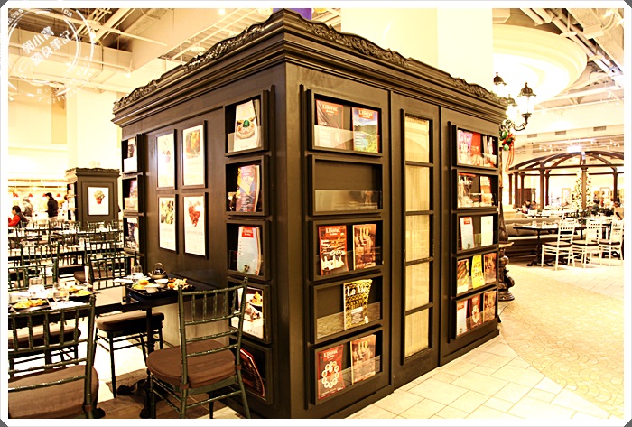 用餐區內可以看到好幾個這樣彷彿在義大利街頭會看到的書報攤,外面擺設的書報雜誌都是可以拿回家的,裡面除了有很多時尚流行資訊以外,還有一些旅遊資訊,我們還一邊吃一邊看,就知道我們把自助餐當成下午茶吃有多舒服了,但是這書報攤可是大有玄機,裡面就是整理客人用餐後的餐盤跟廚餘回收的地方,巧妙的把客人不想看到的通通規範再裡面,讓客人擁有最佳的用餐環境。 |